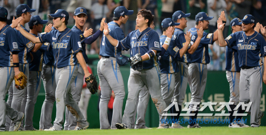 SK와 NC의 2015 KBO 리그 경기가 23일 인천 SK행복드림구장에서 열렸다. NC가 5대1로 승리하며 5연승을 달렸다. 경기 종료 후 기쁨을 나누는 NC 선수들의 모습. 인천=허상욱 기자 wook@sportschosun.com/2015.08.23/