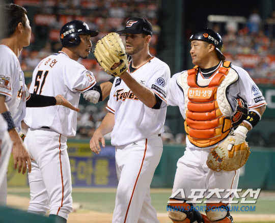 18일 대전 한화생명이글스파크에서 KBO리그 한화 이글스와 NC 다이노스의 경기가 열렸다. 한화 탈보트와 NC 이태양이 선발 맞대결을 펼쳤다. 한화 탈보트가 7회 투구를 마치고 마운드를 내려오며 동료들과 하이파이브를 나누고 있다. 대전=송정헌 기자 songs@sportschosun.com/2015.08.18 |