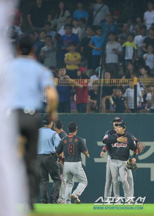 22일 광주 KIA 챔피언스필드에서 KBO리그 한화와 KIA의 경기가 열렸다. KIA 양현종과 한화 로저스가 선발 맞대결을 펼쳤다. KIA 6회 2사 1루에서 필이 중견수 앞에 안타를 날렸다. 한화 중견수 이용규가 볼을 직접 잡아 이닝을 마치는 듯했으나 비디오판독 이후 원바운드로 인정돼 경기가 계속 진행됐다. 수비에 임하던 도중 외야 관중석에서 물병이 날아와 팬과 설전을 벌이던 이용규를 동료들이 말리고 있다. 광주=송정헌 기자 songs@sportschosun.com/2015.08.22