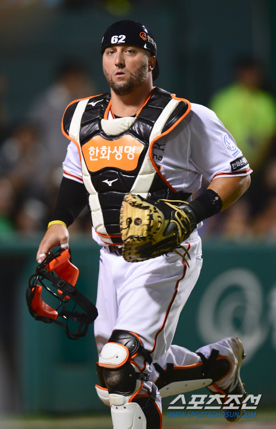2015 프로야구 삼성과 한화의 경기가 26일 대전 한화생명 이글스파크에서 열렸다. 6회 포수로 나선 한화 폭스가 삼성 세 타자를 삼자범퇴로 막고 내려오고 있다. 삼성은 선발투수로 8승 8패 방어율 6.53의 장원삼을 내세웠다. 한화는 8승 6패 방어율 4.96의 안영명이 선발 등판했다. 대전= 정재근 기자 cjg@sportschosun.com/2015.08.26/ |
