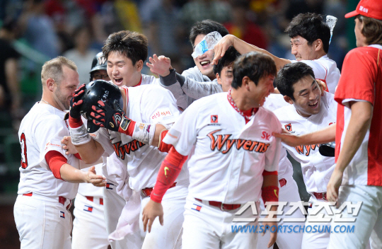 2015 KBO리그 SK와이번스와 KIA타이거즈의 경기가 26일 인천SK행복드림구장에서 열렸다. SK 정상호가 9회말 1사 1,2루에서 끝내기 3점 홈런을 치고 동료들의 축하를 받고 있다. 문학=최문영 기자 deer@sportschosun.com /2015.08.26/