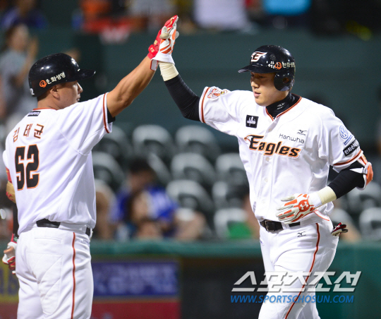 2015 프로야구 삼성과 한화의 경기가 26일 대전 한화생명 이글스파크에서 열렸다. 6회말 2사 1, 2루 한화 김회성이 좌월 3점 홈런을 치고 들어오며 김태균의 축하를 받고 있다. 삼성은 선발투수로 8승 8패 방어율 6.53의 장원삼을 내세웠다. 한화는 8승 6패 방어율 4.96의 안영명이 선발 등판했다. 대전= 정재근 기자 cjg@sportschosun.com/2015.08.26/ |