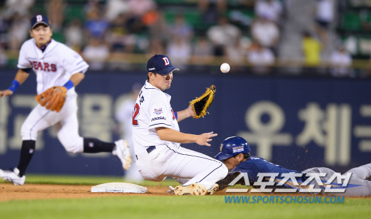 14일 잠실구장에서 KBO리그 두산 베어스와 NC 다이노스의 경기가 열렸다. 두산 장원준과 NC 해커가 선발 맞대결을 펼쳤다. NC 김종호가 7회 나성범 타석 때 2루 도루를 성공시키고 있다. 잠실=송정헌 기자 songs@sportschosun.com/2015.08.14 |
