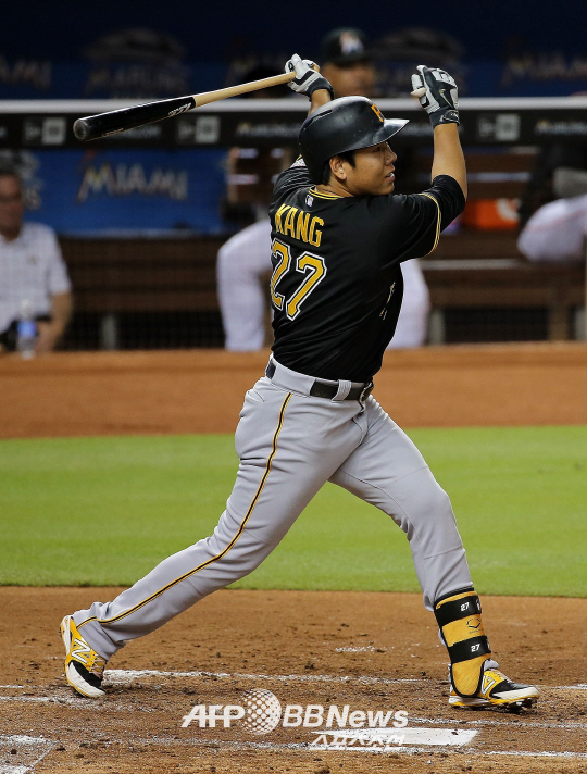 | 피츠버그 강정호가 27일(한국시각) 마이애미와의 원정경기서 2회초 중전안타를 터뜨리고 있다. ⓒAFPBBNews = News1 |