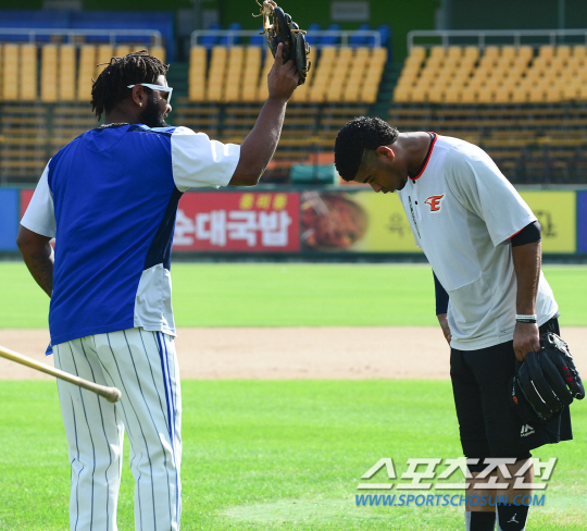 2015 프로야구 삼성과 한화의 경기가 26일 대전 한화생명 이글스파크에서 열린다. 경기 전 삼성 나바로와 한화 로저스가 만나 반갑게(?) 인사를 나눴다. 로저스가 나바로에게 머리를 숙여 인사를 하라며 직접 시범을 보이고 있다. 삼성은 선발투수로 8승 8패 방어율 6.53의 장원삼을 내세웠다. 한화는 8승 6패 방어율 4.96의 안영명이 선발 등판했다. 대전= 정재근 기자 cjg@sportschosun.com/2015.08.26/