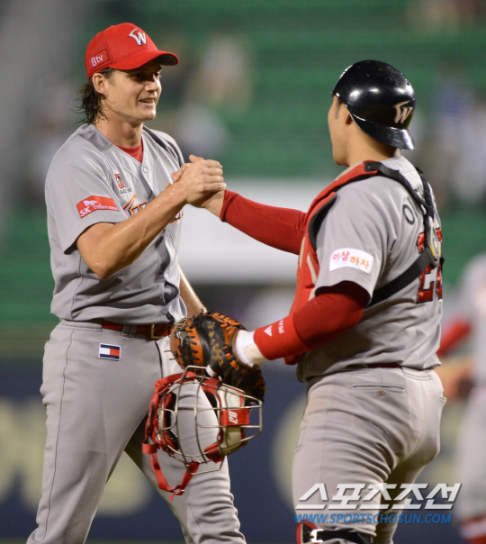 LG와 SK의 2015 KBO 리그 경기가 28일 잠실구장에서 열렸다. 4대0 완봉승을 거둔 SK 세든이 경기 종료 후 포수 이재원과 기쁨을 나누고 있다. 잠실=허상욱 기자 wook@sportschosun.com/2015.08.28/