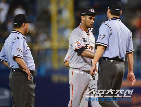 2015 프로야구 한화 이글스와 NC 다이노스의 경기가 27일 마산야구장에서 열렸다. 6회말 NC 조영훈과 나성범에게 적시타를 허용하며 3실점한 한화 로저스가 심판의 볼 판정에 불만을 표시하고 있다. 한화는 선발투수로 3승 방어율 1.31의 로저스를 내세웠다. NC는 15승 4패 방어율 2.67의 해커가 선발 등판했다. 마산= 정재근 기자 cjg@sportschosun.com