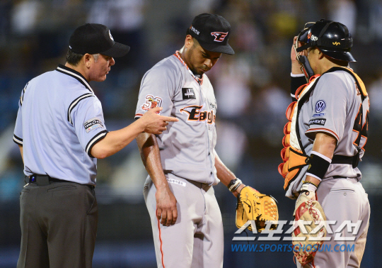 2015 프로야구 한화 이글스와 NC 다이노스의 경기가 27일 마산야구장에서 열렸다. 6회말 NC 조영훈과 나성범에게 적시타를 허용하며 3실점한 한화 로저스가 심판의 볼 판정에 불만을 표시하자 김병주 2루심이 주의를 주고 있다. 한화는 선발투수로 3승 방어율 1.31의 로저스를 내세웠다. NC는 15승 4패 방어율 2.67의 해커가 선발 등판했다. 마산= 정재근 기자 cjg@sportschosun.com/2015.08.27/ |