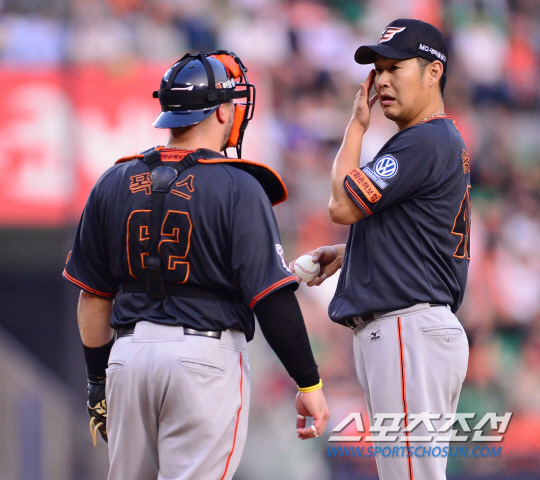 29일 서울 잠실야구장에서 2015 프로야구 한화와 두산의 경기가 열렸다. 2회말 1사 1,2루서 두산 오재일에게 2타점 적시타를 허용한 한화 송은범이 마운드에 오른 폭스와 이야기를 나누고 있다. 잠실=김경민 기자 kyungmin@sportschosun.com