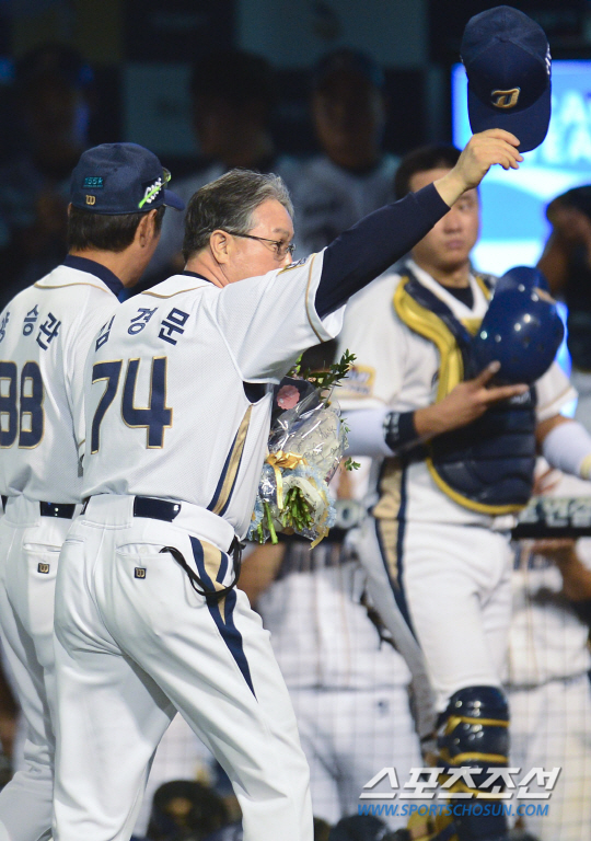 2015 프로야구 한화 이글스와 NC 다이노스의 경기가 27일 마산야구장에서 열렸다. NC가 4-1로 승리한 가운데 통산 700승을 거둔 김경문 감독이 축하 꽃다발을 들고 관중을 향해 모자를 벗어 인사하고 있다. 한화는 선발투수로 3승 방어율 1.31의 로저스를 내세웠다. NC는 15승 4패 방어율 2.67의 해커가 선발 등판했다. 마산= 정재근 기자 cjg@sportschosun.com/2015.08.27/