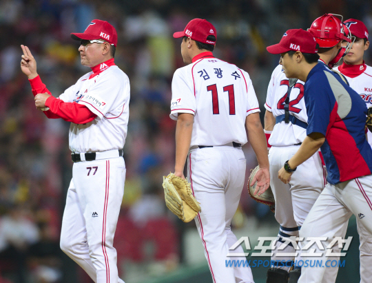 | 2015 프로야구 넥센 히어로즈와 KIA 타이거즈의 경기가 29일 광주 KIA챔피언스필드에서 열렸다. 8회초 무사 3루 넥센 스나이더 타석. KIA 김기태 감독이 마운드에 올라 이야기를 한 후 김광수를 한승혁으로 교체하고 있다. 광주=정재근 기자 cjg@sportschosun.com/2015.08.29/ |