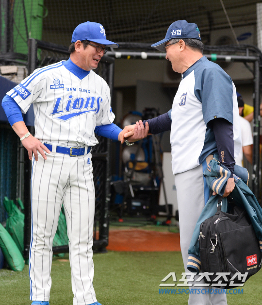 ◇삼성 류중일 감독과 NC 김경문 감독. 지난 20일 대구 2연전에 앞서 인사를 나누는 두 사령탑. 대구=송정헌 기자 songs@sportschosun.com/2015.08.20