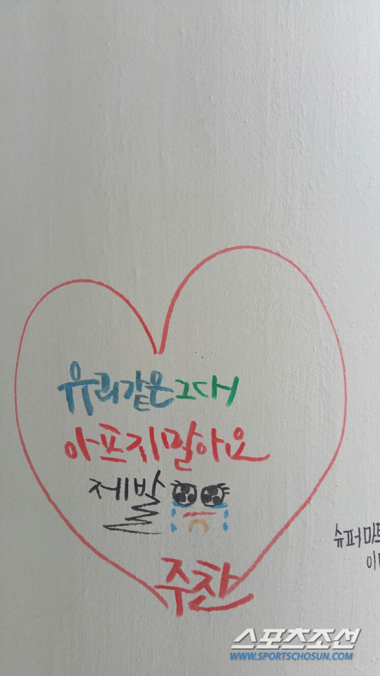| 광주 기아챔피언스필드 3루쪽 홈팀 선수단 출입구 바깥쪽 기둥에 한 팬이 김주찬의 선전을 기원하며 적어놓은 글. |