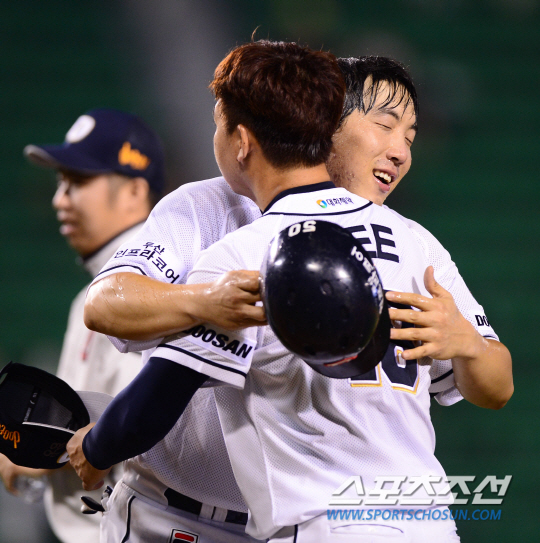 2015프로야구 두산과 한화의 경기가 30일 잠실 야구장에서 펼쳐 졌다. 두산 10회말 2사 만루에서 한화 투수 이동걸의 폭투를 틈타 결승 득점을 올린 김현수가 승리 투수가 된 이현승과 포옹을 하고 있다. 잠실=조병관기자 rainmaker@sportschosun.com/2015.08.30/