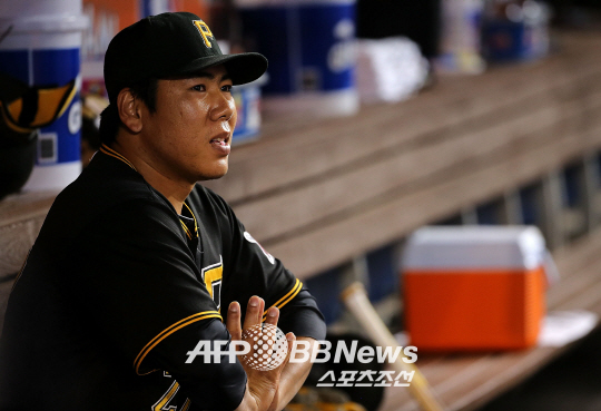 | 강정호가 지난 27일 마이애미전에서 덕아웃에서 경기를 지켜보고 있다. Mike Ehrmann/Getty Images/AFP ⓒAFPBBNews = News1 |