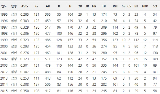 | 이승엽의 통산 성적표. 왼쪽부터 타율, 게임수, 타수, 득점, 안타수, 2루타, 3루타, 홈런. 루타, 타점, 도루, 도루자, 볼넷, 사구, 삼진(SO). 2004년부터 2011년까지는 일본프로야구에서 뛰었다. |