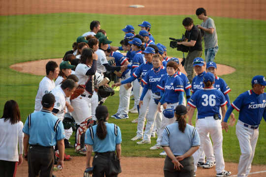 | 한국 A팀과 일본 아사히 트러스트가 결승전에 앞서 인사를 했다. 사진제공=LG전자 |