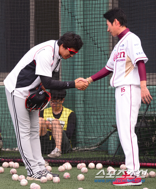 2015 프로야구 LG 트윈스와 넥센 히어로즈의 경기가 1일 목동구장에서 열린다. 확대 엔트리에 맞춰 1군에 올라온 LG 이병규가 경기 전 그라운드에 나와 넥센 염경엽 감독과 악수를 나누고 있다. LG는 선발투수로 8승 8패 방어율 4.70의 루카스를 내세웠다. 넥센은 10승 8패 방어율 4.14의 피어밴드가 선발 등판한다. 목동=정재근 기자 cjg@sportschosun.com/2015.09.01/