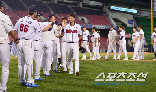 1일 오후 서울 잠실야구장에서 2015 프로야구 SK와 두산의 경기가 열렸다. 6대5로 승리한 후 두산 선수들이 하이파이브를 나누고 있다. 잠실=김경민 기자 kyungmin@sportschosun.com / 2015.09.01. |