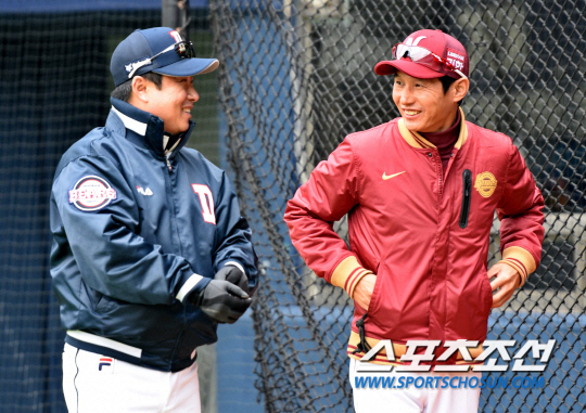 7일 오후 서울 잠실야구장에서 열릴 2015 프로야구 넥센과 두산의 경기에 앞서 김태형 감독(왼쪽)과 염경엽 감독이 반갑게 인사를 나누고 있다. 잠실=김경민 기자 kyungmin@sportschosun.com / 2015.04.07.