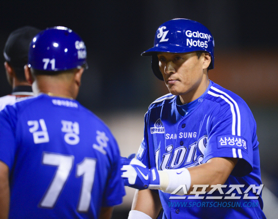 2015 프로야구 삼성과 한화의 경기가 26일 대전 한화생명 이글스파크에서 열렸다. 4회초 1사 1, 3루 삼성 이승엽이 1타점 안타를 치고 나가 김평호 코치의 축하를 받고 있다. 삼성은 선발투수로 8승 8패 방어율 6.53의 장원삼을 내세웠다. 한화는 8승 6패 방어율 4.96의 안영명이 선발 등판했다. 대전= 정재근 기자 cjg@sportschosun.com