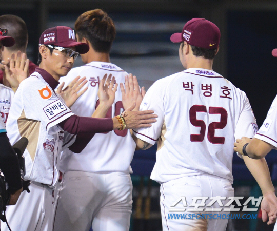 2015 프로야구 LG 트윈스와 넥센 히어로즈의 경기가 1일 목동구장에서 열렸다. 넥센이 11-2의 대승을 거둔 가운데 염경엽 감독이 선수들과 하이파이브를 하고 있다. LG는 선발투수로 8승 8패 방어율 4.70의 루카스를 내세웠다. 넥센은 10승 8패 방어율 4.14의 피어밴드가 선발 등판했다. 목동=정재근 기자 cjg@sportschosun.com/2015.09.01/