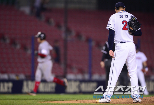 4연승의 두산과 3연패의 SK가 2일 잠실에서 다시 만났다. 호투하던 두산 선발 장원준이 8회 SK 이재원에게 동점 투런 홈런을 허용하고 아쉬워 하고 있다. 잠실=조병관기자 rainmaker@sportschosun.com