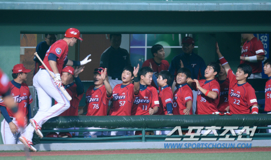 | 2015 KBO리그 한화이글스와 KIA타이거즈의 경기가 1일 청주야구장에서 열렸다. KIA 2회초 선두타자 브렛필이 좌월 솔로홈런을 치고 동료들의 축하를 받고 있다.청주=최문영 기자 deer@sportschosun.com /2015.09.01/ |