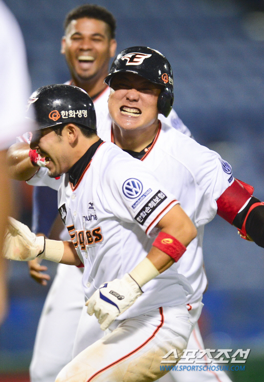 2015 프로야구 삼성과 한화의 경기가 26일 대전 한화생명 이글스파크에서 열렸다. 11회말 2사 1, 2루 한화 김태균이 끝내기 안타를 친 후 동료들의 구타(?)를 참지 못해 이용규를 향해 달려들고 있다. 삼성은 선발투수로 8승 8패 방어율 6.53의 장원삼을 내세웠다. 한화는 8승 6패 방어율 4.96의 안영명이 선발 등판했다. 대전= 정재근 기자 cjg@sportschosun.com/2015.08.26/