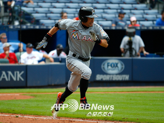 애틀랜타전 8회 이치로가 타구를 날린 뒤 1루로 질주하고 있다. ⓒAFPBBNews = News1