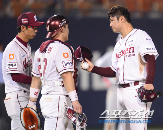 히어로즈 코칭스태프는 1점차로 쫓기자 손승락을 내리고 김대우를 올려 9대8로 승리를 지켰다.