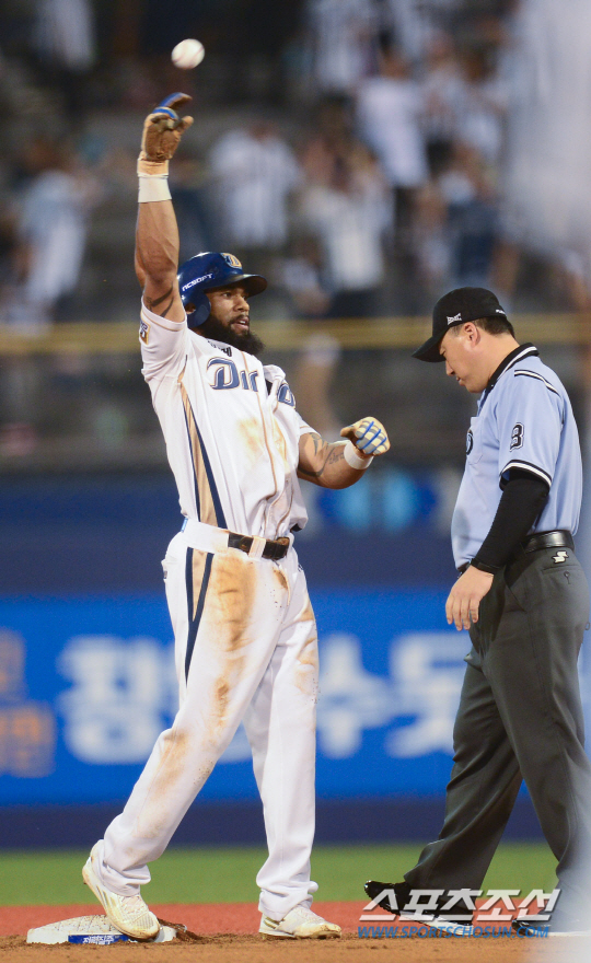 2015 프로야구 한화 이글스와 NC 다이노스의 경기가 28일 마산구장에서 열렸다. 3회말 2사 1루 NC 나성범 타석 때 테임즈가 2루도루를 성공하며 30홈런-30도루의 기록을 달성했다. 한화 권용관으로부터 기념공을 건네받은 테임즈가 덕아웃을 향해 공을 던지고 있다. 테임즈의 30-30 기록은 2000년 현대 박재홍의 30-30 기록 이후 15년만의 대기록이다. 마산= 정재근 기자 cjg@sportschosun.com