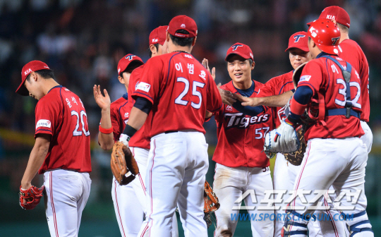 2015 KBO리그 한화이글스와 KIA타이거즈의 경기가 2일 청주야구장에서 열렸다. KIA 선수들이 5대4 한점차 승리를 확정지은후 하이파이브 하고 있다. 청주=최문영 기자 deer@sportschosun.com /2015.09.02/