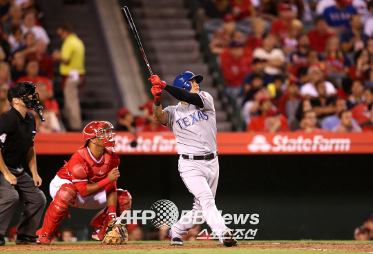 텍사스 추신수가 5일(한국시각) LA 에인절스전에서 7회 좌중간 3루타를 터뜨리고 있다. ⓒAFPBBNews = News1