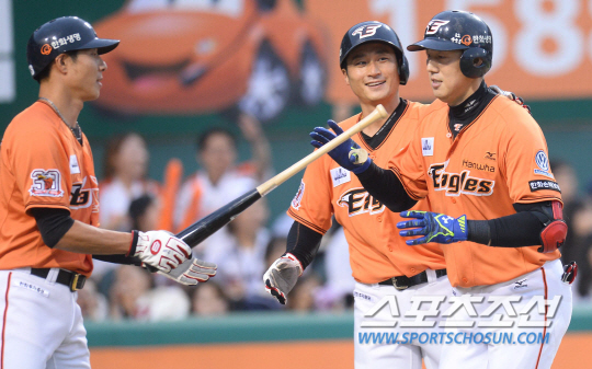 2015 KBO리그 한화이글스와 두산베어스의 경기가 5일 대전 한화이글스파크에서 열렸다. 한화 3회말 1사 1,2루에서 김회성이 좌월 3점 홈런을 치고 동료들의 축하를 받고있다. 대전=최문영 기자 deer@sportschosun.com