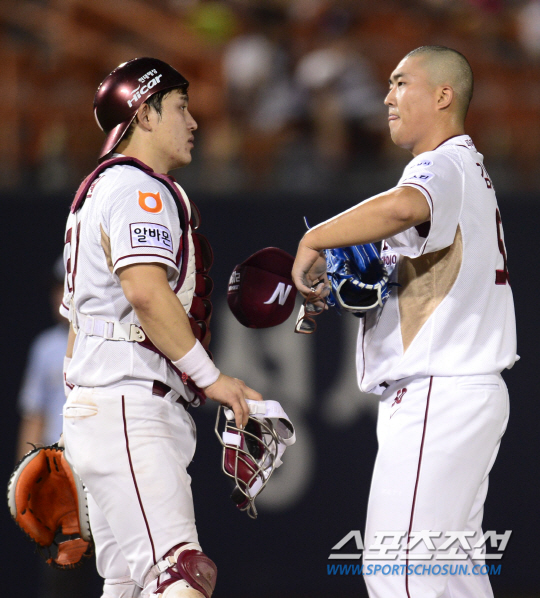 | 2015 프로야구 롯데 자이언츠와 넥센 히어로즈의 경기가 17일 목동구장에서 열렸다. 4회초 2사 1, 2루 롯데 이우민 타석에서 넥센 박동원 포수가 마운드에 올라 김영민을 진정시키고 있다. 목동=정재근 기자 cjg@sportschosun.com/2015.08.17/ |
