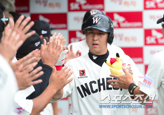 2015 프로야구 넥센 히어로즈와 SK 와이번스의 경기가 6일 잠실구장에서 열렸다. 1회말 1사 1루 SK 최정이 좌월 투런포를 치고 들어와 축하를 받고 있다. 넥센은 선발투수로 시즌성적 11승 8패 방어율 4.10의 피어밴드를 내세웠다. SK에서는 3승 7패 방어율 5.12의 박종훈이 선발 등판했다. 인천=정재근 기자 cjg@sportschosun.com