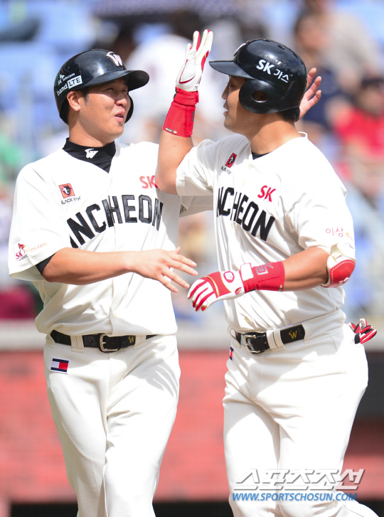 2015 프로야구 넥센 히어로즈와 SK 와이번스의 경기가 6일 잠실구장에서 열렸다. 3회말 2사 1루 SK 정의윤이 좌월 투런포를 치고 들어오며 최정의 축하를 받고 있다. 인천=정재근 기자 cjg@sportschosun.com/2015.09.06/