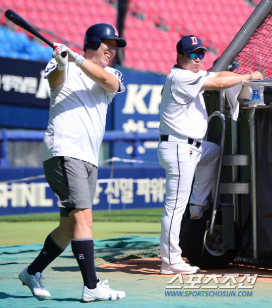 | 김현수가 타격 훈련을 하며 김태형 두산 감독과 농담을 주고 받고 있다. 스포츠조선 DB. |