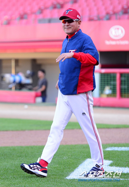 8일 오후 광주 기아챔피언스필드에서 열릴 2015 프로야구 NC와의 경기에 앞서 KIA 김기태 감독이 선수들의 훈련을 지켜보고 있다. 광주=김경민 기자 kyungmin@sportschosun.com / 2015.09.08.