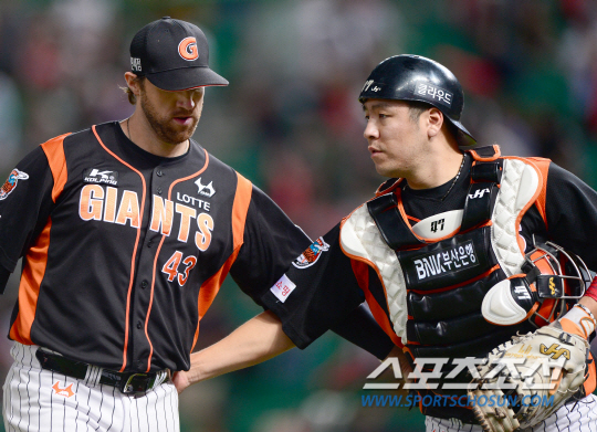 8일 인천 SK행복드림구장에서 KBO리그 SK 와이번스와 롯데 자이언츠의 2연전 첫 번째 경기가 열렸다. SK 켈리와 롯데 린드블럼이 선발 맞대결을 펼쳤다. 롯데 린드블럼이 3회 무사 1, 3루의 위기를 무실점으로 넘겼다. 강민호와 하이파이브를 나누고 있는 린드블럼. 인천=송정헌 기자 songs@sportschosun.com/2015.09.08 |
