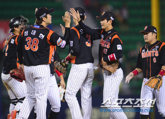 2015 프로야구 롯데 자이언츠와 LG 트윈스의 경기가 5일 잠실구장에서 열렸다. 9-4의 승리를 거두며 5연승을 달린 롯데 선수들이 승리의 하이파이브를 하고 있다. 롯데는 선발투수로 시즌성적 1승 방어율 4.85의 이명우를 내세웠다. LG에서는 7승 7패 방어율 3.55의 우규민이 선발 등판했다. 잠실=정재근 기자 cjg@sportschosun.com/2015.09.05/