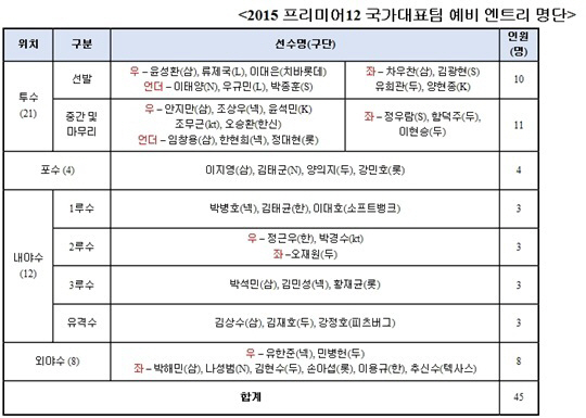 이대호(소프트뱅크), 오승환(한신), 이대은(지바 롯데) 등 일본프로야구(NPB) 선수들과 더불어 강정호와 추신수의 이름이 눈에 띈다. 메이저리그 사무국은 'MLB 40인 로스터에 포함된 선수들은 프리미어 12 출전을 금지한다'라고 결정한 바 있다.,