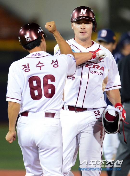 2015 프로야구 두산 베어스와 넥센 히어로즈의 경기가 9일 목동구장에서 열렸다. 6히말 1사 만루 넥센 박병호가 두산 니퍼트를 상대로 역전 2타점 안타를 치고 3루로 공이 송구되는 사이 2루까지 나가 정수성 코치의 축하를 받고 있다. 두산은 선발투수로 시즌성적 3승 1패 방어율 2.88의 허준혁을 내세웠다. 넥센에서는 5패 방어율 5.86의 문성현이 선발 등판했다. 목동=정재근 기자 cjg@sportschosun.com/2015.09.09/