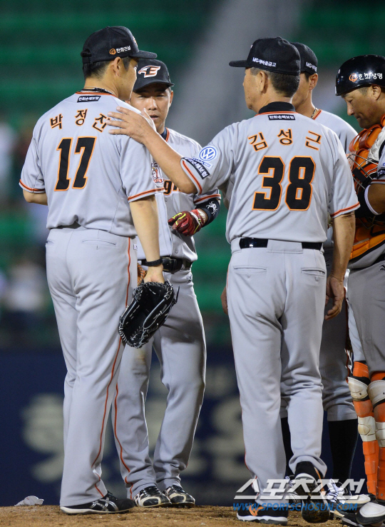 2015 KBO리그 LG트윈스와 한화이글스의 경기가 8일 서울 잠실야구장에서 열렸다. 한화 김성근 감독이 9회초 1사 1,2루에서 박용택에게 적시타를 맞은 박정진을 격려하고 있다. 잠실=최문영 기자 deer@sportschosun.com /2015.09.08/