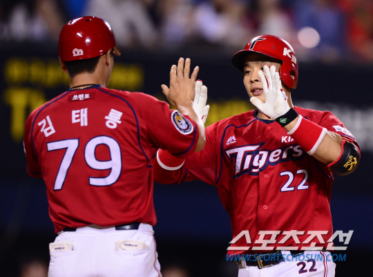 2015 프로야구 두산과 KIA의 경기가 10일 잠실 야구장에서 펼쳐 졌다. KIA 백용환이 7회 동점 솔로 홈런을 치고 김태룡 코치와 하이파이브를 하고 있다. 잠실=조병관기자 rainmaker@sportschosun.com/2015.09.10/