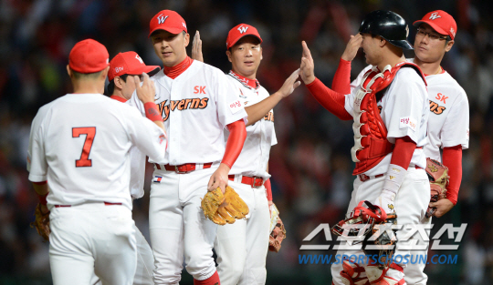 SK와 롯데의 2015 KBO 리그 경기가 9일 인천 SK행복드림구장에서 열렸다. SK가 3대2로 승리하며 롯데의 7연승 행진에 제동을 걸었다. 경기 종료 후 승리의 기쁨을 나누는 SK 선수들의 모습. 인천=허상욱 기자 wook@sportschosun.com/2015.09.09/