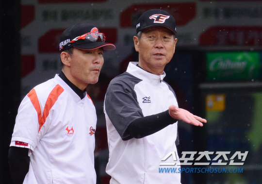 12일 오후 부산 사직야구장에서 열릴 2015 프로야구 한화와 롯데의 경기에 앞서 비가 내리는 가운데 김성근 감독과 이종운 감독이 이야기를 나누고 있다. 부산=김경민 기자 kyungmin@sportschosun.com