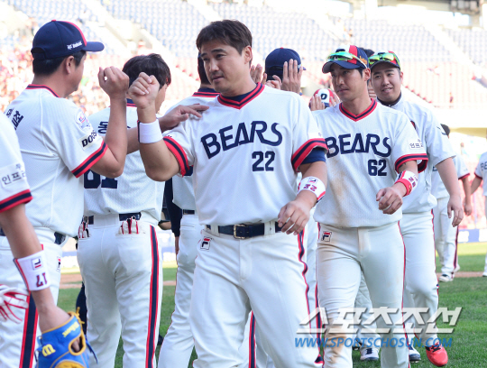 13일 잠실구장에서 KBO리그 두산 베어스와 kt 위즈의 주말 2연전 두 번째 경기가 열렸다. 최근 6연패를 기록 중이던 두산이 kt에 4대3으로 승리하며 연패를 탈출했다. 경기 종료 후 하이파이브를 나누고 있는 두산 선수들. 잠실=송정헌 기자 songs@sportschosun.com/2015.09.13
