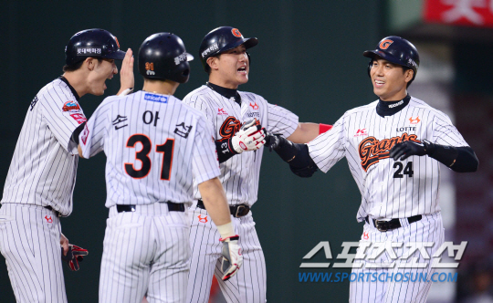 12일 오후 부산 사직야구장에서 2015 프로야구 한화와 롯데의 경기가 열렸다. 2회말 1사 만루서 롯데 김문호가 우중월 만루홈런을 친 후 홈에서 동료들과 하이파이브를 나누고 있다. 부산=김경민 기자 kyungmin@sportschosun.com / 2015.09.12.